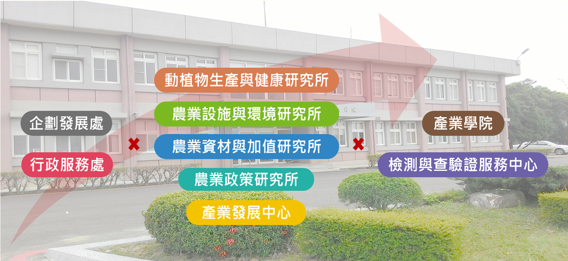 原「動物科技研究所」、「植物科技研究所」及「水產科技研究所」三所,經整併重整為「動植物生產與健康研究所」、「農業設施與環境研究所」及「農業資材與加值研究所」,以強化跨領域整合、聚焦研發能量,並推進必要之業務前瞻發展;原「農業政策研究中心」更名為「農業政策研究所」,使其名稱與其業務職掌相符;「總管理處」更名為「行政服務處」,以更精確反映實際業務執掌定位;另因應策略規劃與資源整合管理之需要,新增設「企劃發展處」。